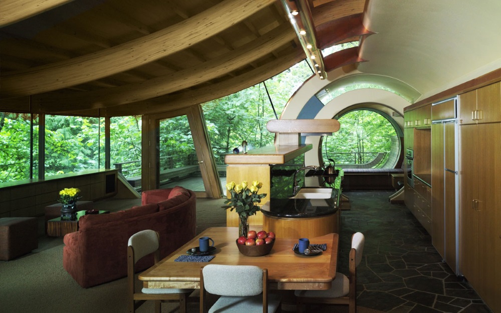 First we have the Wilkinson Residence, completed in 2004 and designed by Robert Oshatz. This stunning example of modern architecture is extravagant but fits tastefully into its environment through the choice of textures and use of huge curved glass windows. Featuring a Japanese garden, a spacious open plan interior and all the furnishings you could want, this example is more of a tree mansion than a tree house!