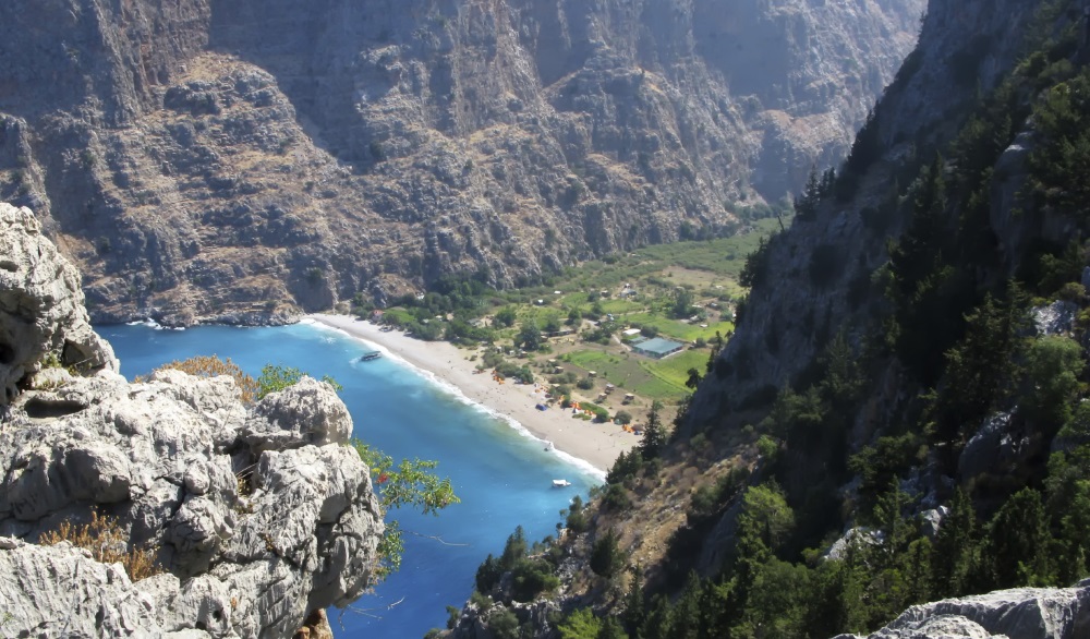 This narrow canyon ends in a wide, sandy beach and is known for its clouds of colourful butterflies. Most people get a boat from Olu Deniz. The beach is a listed nature reserve, so the facilities are basic. You can camp here and there is a self-service restaurant. The nearest town is Fethiye, where you can buy a one-bedroom apartment for less than £30,000.